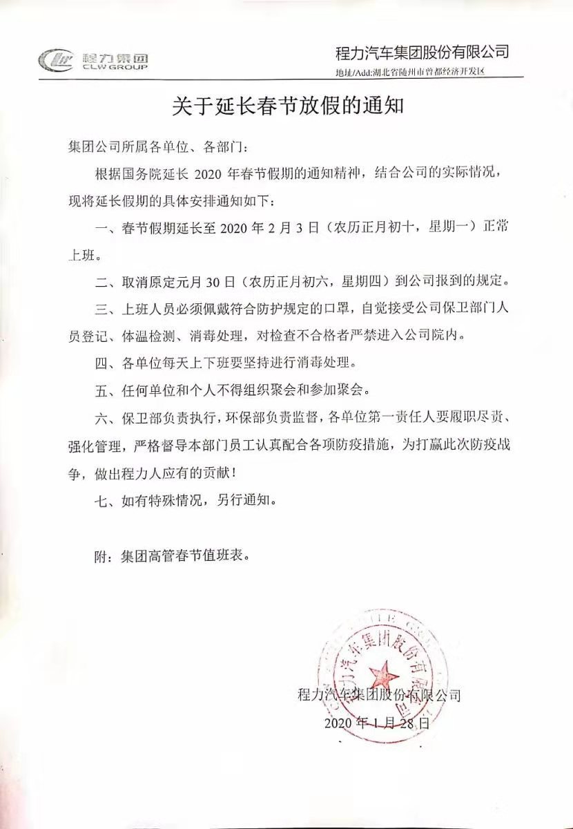 導讀:湖北程力汽車集團關于延長春節放假的通知:集團公司所屬各單位、各部門:為加強新型冠狀病毒感染的肺炎疫情防治工作,有效減少人員聚集,阻斷疫情傳播,根據上級通…