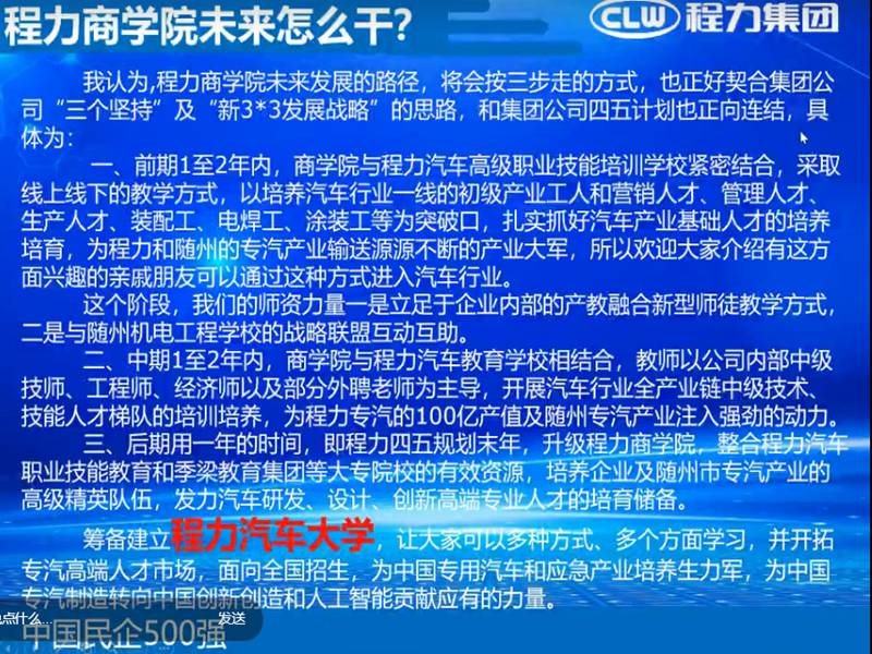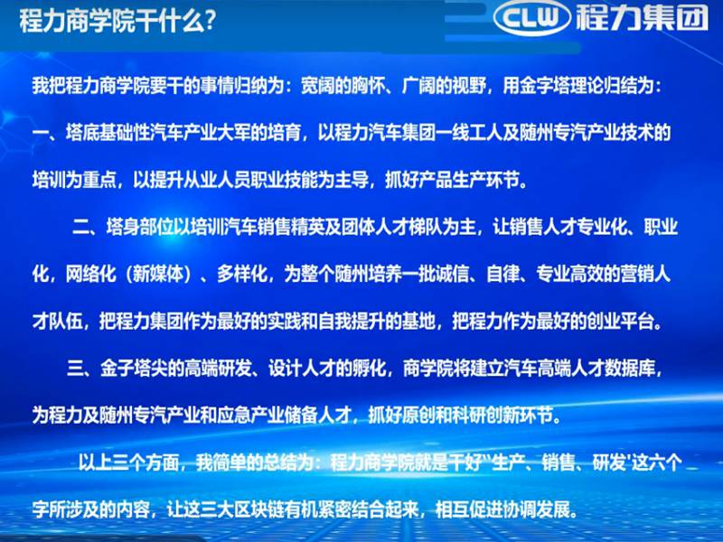 簡單的講,程力商學院就是以汽車研發生產銷售為主要內容,進行學習交流的職業教育平臺,它分為線上網絡直播課堂學習及線下實體培訓學習的兩種方式,商學院匯聚了社會各界的專家、教授,智囊、企業家、行業泰斗、營銷精英及政商高端人才,是汽車產業發展的知識寶庫和動力源泉,商學院從2018年籌建上線,至今已2年