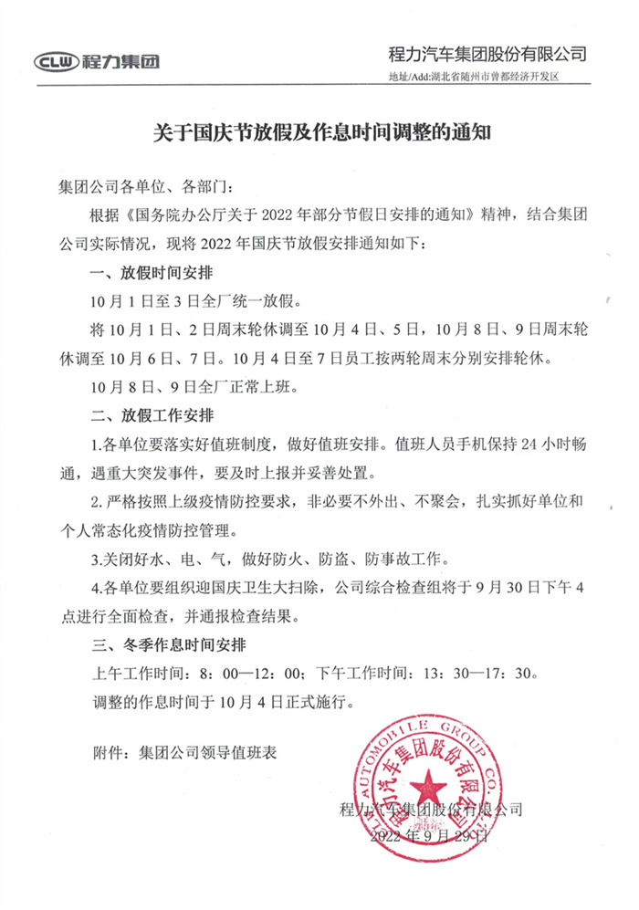 湖北程力集團關于國慶節放假及作息時間調整的通知