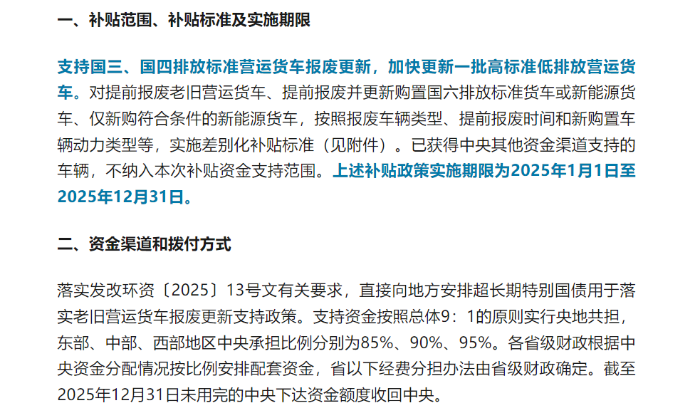 (下午)三部門聯合升級貨車更新政策:交通運輸部、發改委、財政部將老舊貨車補貼范圍擴展至國三/國四排放車輛,取消燃料類型限制。根據新規,提前報廢并更換新能源貨車的企業最高可獲14萬元/車補貼,購置國六車型補貼7萬元。政策特別設置"綠色通道",對參與氫燃料電池車示范運營的企業額外給予3萬元運營補貼。支持資金按照總體9:1的原則實行央地共擔。