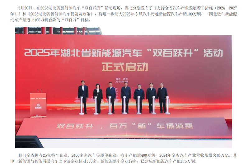 湖北分別發布了《支持全省汽車產業發展若干措施(2024—2027年)》和《2025湖北省新能源汽車促消費政策》,將進一步助力2025年“湖北造”新能源汽車產量邁上100萬輛臺階的目標。