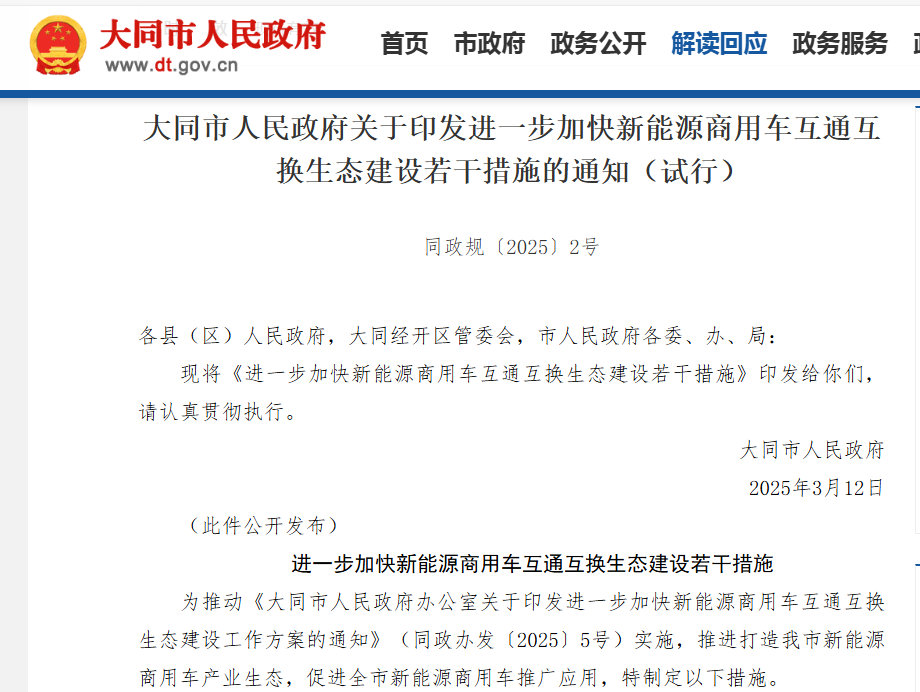 山西省大同市出臺《新能源商用車互通互換生態建設若干措施》,推出"三大攻堅計劃":公共交通全面電動化(2026年底公交車輛100%新能源化)、環衛設備清潔化(新能源占比提升至60%)、重卡換電網絡化(新建50座智能換電站)。創新推出"車電分離"商業模式,通過標準化電池包設計實現不同品牌車輛換電兼容。計劃三年內建成"風光儲換"一體化示范項目10個,降低物流企業用能成本30%。