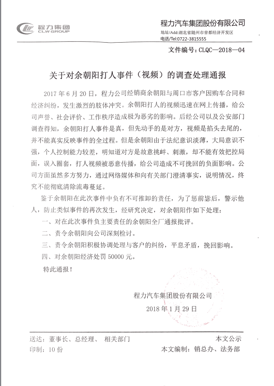 導(dǎo)讀:2018年1月29日,湖北程力汽車集團(tuán)股份有限公司對2017年6月20日,關(guān)于對余朝陽打人事件(視頻)的調(diào)查處理做出了通報(bào)。我們來看看,相關(guān)事件目前在網(wǎng)上流…
