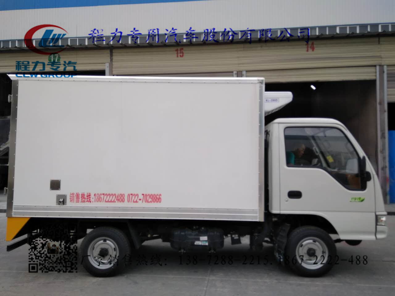 2.上裝配置:冷藏廂體內部有效尺寸:長3.1米×寬1.52米×高1.65米,容積7.8立方,廂體蒙皮采用內外玻璃鋼,隨客戶選擇內置槽鋼焊接骨架或者玻璃纖維超輕高強度骨架,填充8cm厚聚氨酯保溫層,不銹鋼包角,不銹鋼門框,不銹鋼門鎖件,防滑花紋鋁底板,配后雙開門,選開右側側門,-5度或者-18度制冷機組可選。