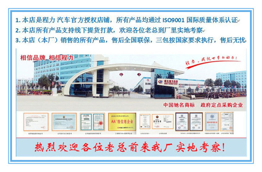 整車出具:正規底盤合格證,正規整車合格證,正規車輛購置稅發票,全國統一機動車,隨車工具,車輛質保手冊,車輛使用說明書,全國服務站名錄等。讓您上戶無憂,方便快捷!
