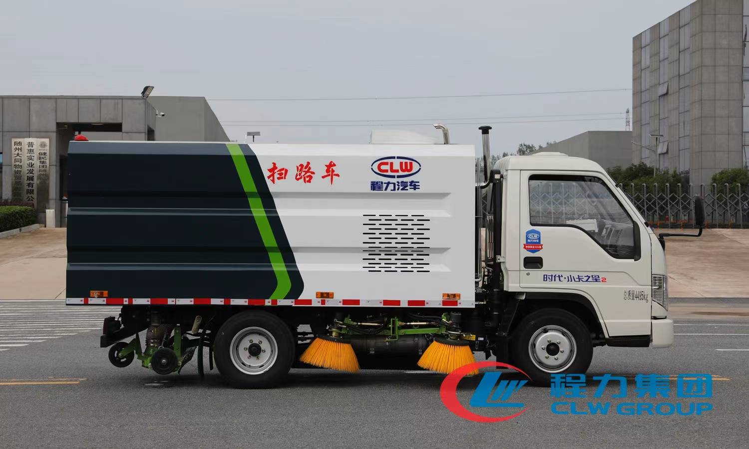 上裝配置:該車型在二類底盤上進行改裝,加裝副發動機、風機、清水箱、垃圾箱、掃刷、后置吸盤,掃盤降塵系統,液壓系統、裝置電控系統和副車架等改裝而成。