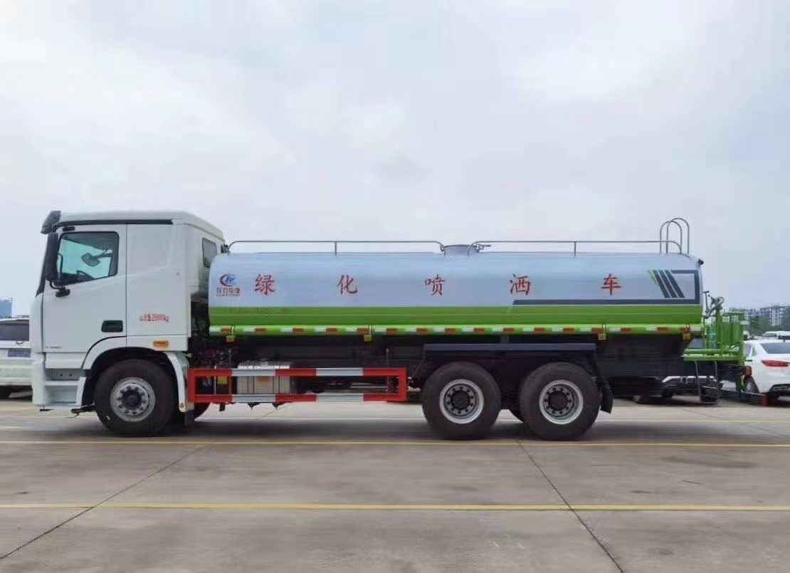 湖北程力國(guó)六歐曼后雙橋18-20方綠化噴灑車(chē)(灑水車(chē))程力威牌CLW5250GPSBDP型綠化噴灑車(chē)廠家配置: 湖北程力國(guó)六福田歐曼GTL后雙橋20噸灑水車(chē)底盤(pán)配置:采用福田歐曼后雙橋原裝底盤(pán),福田歐曼GTL豪華駕駛室,4400+1350mm軸距,搭載國(guó)六(國(guó)Ⅵ)東風(fēng)康明斯260馬力柴油發(fā)動(dòng)機(jī),功率191kw,國(guó)六排放,陜齒法士特八檔變速箱,11.00R20鋼絲胎,前橋5T,后橋雙10T,方向助力,斷氣剎,排氣制動(dòng),原裝空調(diào),行駛記錄儀,多媒體顯示屏,電動(dòng)門(mén)窗,中控鎖,氣囊座椅,ABS。 湖北程力國(guó)六福田歐曼GTL后雙橋20方灑水車(chē)專(zhuān)用配置:罐體容積:18立方米,罐體鋼板為5mm碳鋼Q235材質(zhì)專(zhuān)用容積板一次成型,罐內(nèi)隔板具有防波作用,以減輕汽車(chē)行駛時(shí)罐體液體沖擊;配大功率專(zhuān)用灑水泵,泵可自吸自排;整車(chē)前沖、后灑、側(cè)噴、后平臺(tái)帶綠化灑水炮,灑水炮可全方位旋轉(zhuǎn),可連續(xù)調(diào)成直沖狀、大雨、小雨、毛毛雨;前封頭帶水位計(jì),后平臺(tái)主管路帶1寸澆花接口,后爬梯,帶1個(gè)消防接頭,帶1個(gè)自流閥,1個(gè)過(guò)濾裝置。
